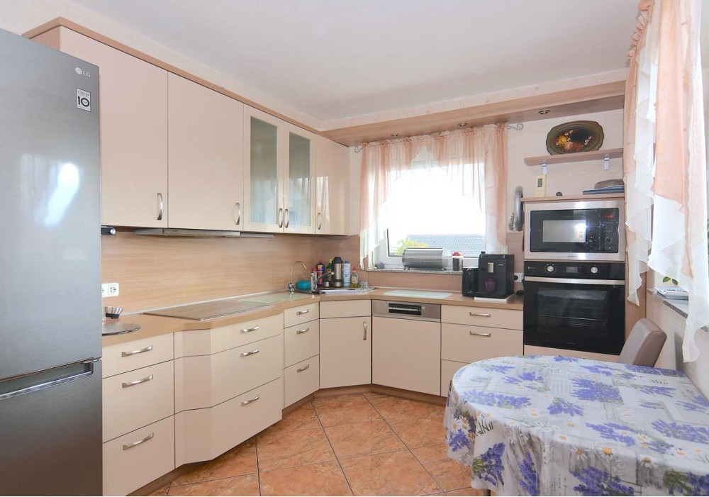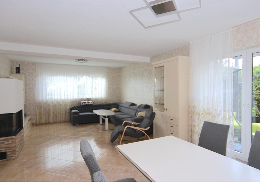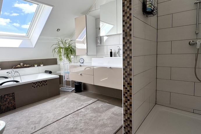 Mit einer Gesamtwohnfläche von ca. 206 m², aufgeteilt in Haupt- und Einliegerwohnung, bietet das Haus ausreichend Platz für bis zu zwei Haushalte. Die Hauptwohnung erstreckt sich über mehrere Ebenen und ermöglicht komfortables Wohnen auf einer Ebene – mit Wohnzimmer, Schlafzimmer, Küche mit Hauswirtschaftsraum (inkl. Waschmaschine und Trockner), direktem Zugang zur Terrasse und zusätzlichem Zimmer. Im ausgebauten Dachgeschoss befindet sich ein großer Balkon, der vielseitig nutzbar ist.